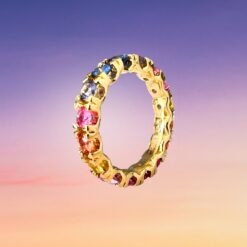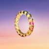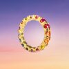 Un anello dalle sinuose geometrie che si avvolge al dito con eleganti accostamenti cromatici, disegnando lo splendore delle sue lucenti spire.