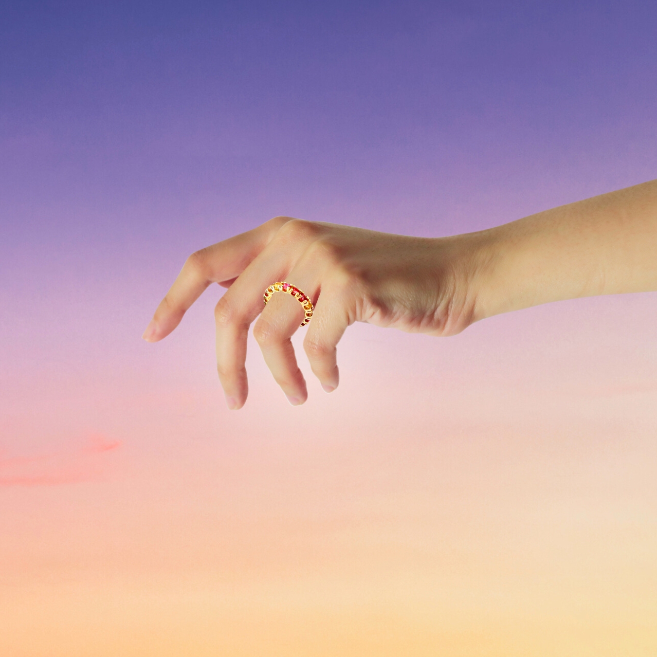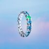 Un anello dalle sinuose geometrie che si avvolge al dito con eleganti accostamenti cromatici, disegnando lo splendore delle sue lucenti spire.