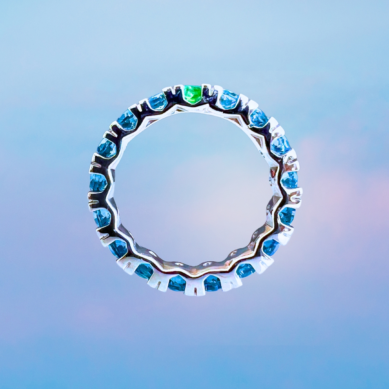 Un anello dalle sinuose geometrie che si avvolge al dito con eleganti accostamenti cromatici, disegnando lo splendore delle sue lucenti spire.