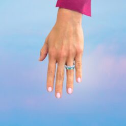 Un anello dalle sinuose geometrie che si avvolge al dito con eleganti accostamenti cromatici, disegnando lo splendore delle sue lucenti spire.